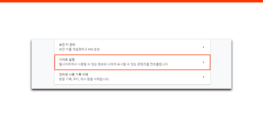 고급을 클릭하면, 스크롤을 내리다 보면 개인정보 및 보안 탭 안에 사이트 설정이라는 옵션이 있다. 여기로 들어가게 되면